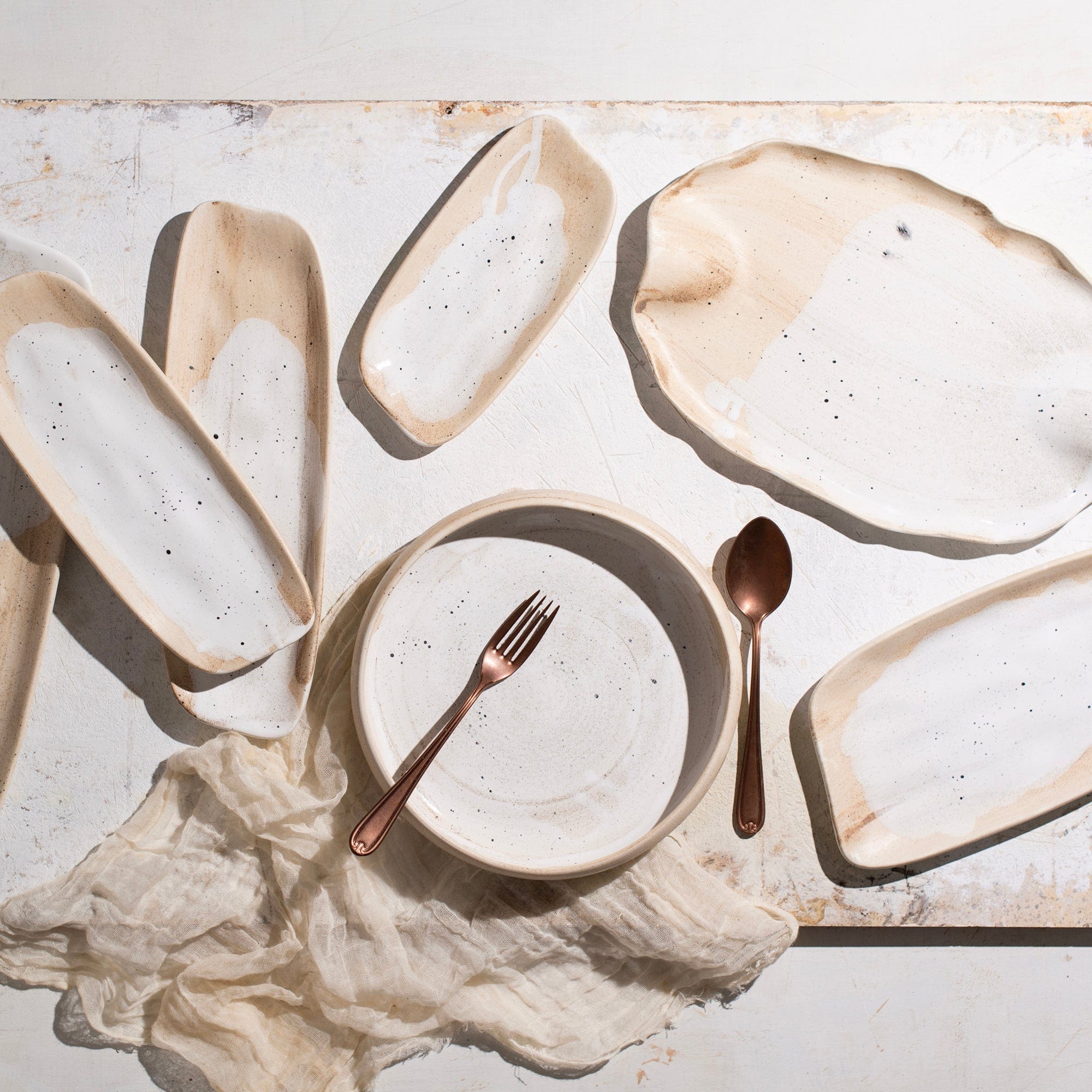 With a matte tan base and a sweeping brush of ocean blue, Coastal captures the calm of the shoreline. Each piece features a unique reactive glaze, bringing natural variation and seaside charm to the table. Serene, effortless, and full of character.