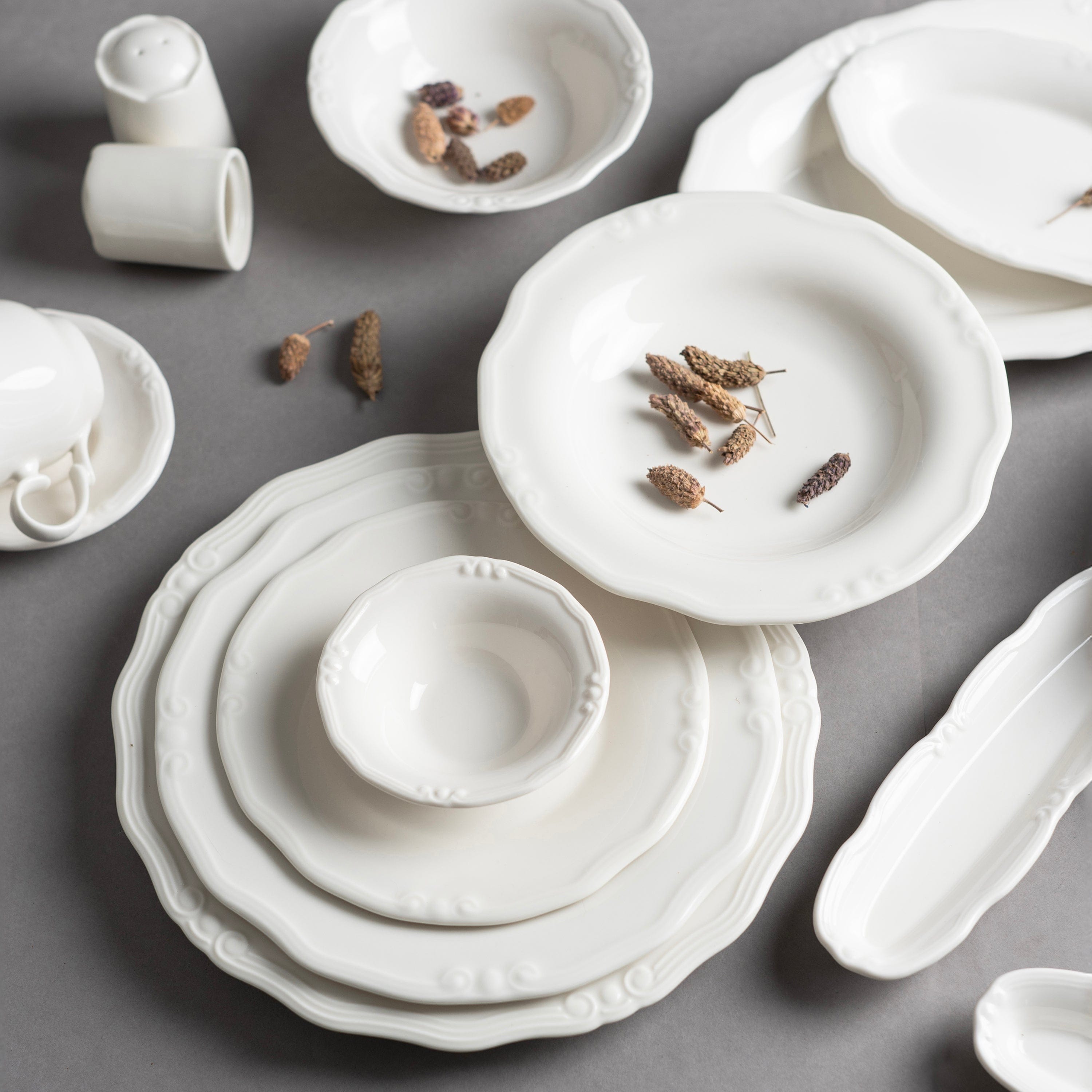 Romantic and refined, the Floret collection features a delicate floral relief that adds charm to any setting. Available in matte white and bronze, this porcelain dinnerware creates an elegant canvas for beautifully plated dishes.